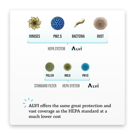 ALVI® filters capture harmful airborne particles like bacteria, viruses, and germs as small as 0.007 microns. This ensures a cleaner, safer environment for your family. Unlike standard filters that only catch larger dust particles, ALVI® provides advanced protection for the air you breathe.
