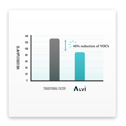 Volatile Organic Compounds (VOCs), often responsible for household odors, come from everyday items like fuels, paints, and cleaning products. ALVI® filters are expertly designed and third-party tested to remove these VOCs, along with mold spores and other harmful particles. In independent tests, ALVI® filters reduced nearly half of the VOCs in newly built homes within 48 hours, ensuring fresher, cleaner air in your home.